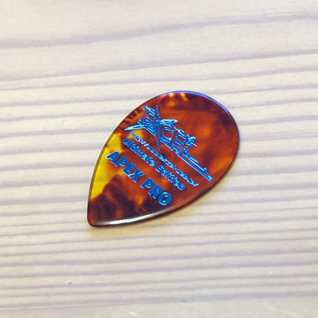 基本的に上記の理由が気に入ってるポイントですが、ピックは大体2、3種類のモノを使う様にしています。例えばアコギ用とエレキ用、メタルの時はあれで…と言う風に分けて考えてる部分があるのですが、EXCELピックは本当に色んなジャンルに対応出来るカタチと音質を兼ね備えたピックですね。
